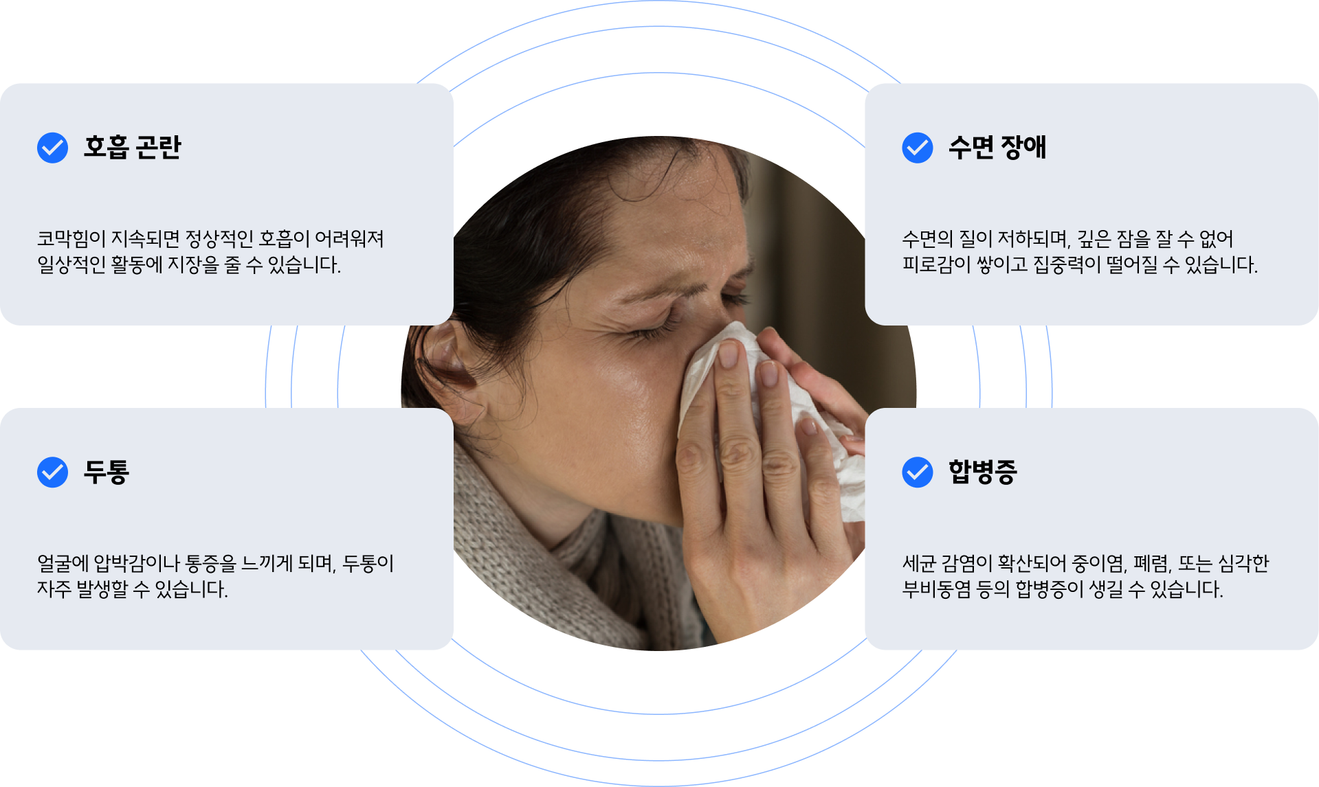 코막힘이 지속되면 정상적인 호흡이 어려워져 일상적인 활동에 지장을 줄 수 있습니다.